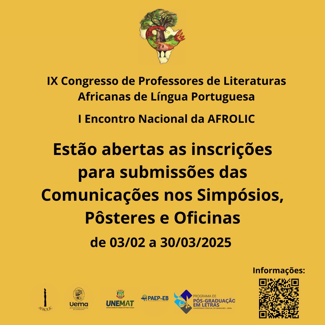 O IX Congresso de Professores de Literaturas Africanas de Língua Portuguesa e o I Congresso Nacional da AFROLIC acontecerão de 04 a 06 de junho de 2025, na cidade de São Luís – MA, e serão sediados na Faculdade de História da Universidade Estadual do Maranhão (UEMA), no Centro Histórico.